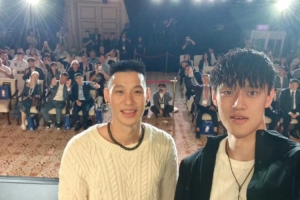 今天,媒体人勇方方晒出了林书豪和曾凡博的合照,并写道:“嚯!两任首钢7号相聚了!”