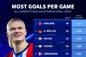 体育资讯10月13日讯 德国转会市场统计了足坛历史球员在国家队的场均进球数量,并列出榜单,哈兰德1.11球居首,盖德-穆勒、柯奇士次席。