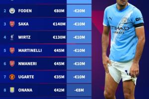 体育资讯10月17日讯 德转更新英超身价,其中跌的最多的是罗德里和福登,他们身价都下降了2000万欧。