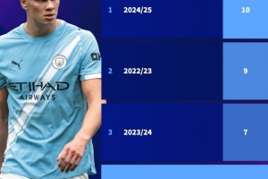 哈兰德本赛季在前5轮英超打进6球,但这已经是他加盟曼城后前5场英超最低进球数据,他在24/25赛季同期10球,22/23赛季9球,23/24赛季则是7球。