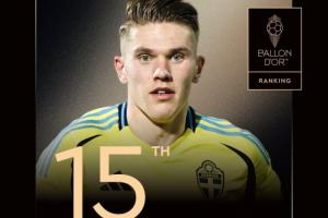 阿森纳前锋约克雷斯排名第15名,这是他第1次获得提名。