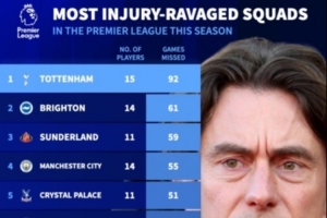 体育资讯11月25日讯 德转列本赛季英超球队伤病榜,热刺15名球员受伤,共计缺席92场比赛排名第一,布莱顿、桑德兰位列二三位。