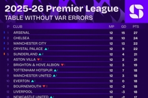 若无VAR误判的英超积分榜:阿森纳继续领跑 桑德兰升至第五