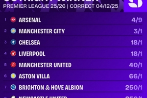 体育资讯12月5日讯 相关机构列出了本赛季英超最新的夺冠赔率,阿森纳居首,曼城、切尔西、利物浦前四。