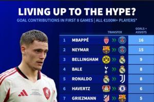 德转“恶趣味”地统计了转会费上亿欧元的攻击手们为新球队出战前8场比赛,在进球+助攻上的贡献榜单。姆巴佩、内马尔、贝林厄姆分列前3,而最后一名可谓是为了这碟醋才包的这盘饺子...